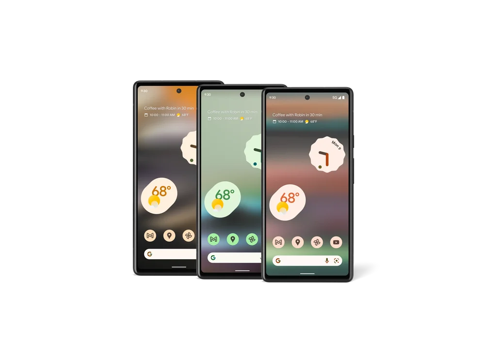 Pixel 6aの本体カラーは「Sage」(薄緑)、「Chalk」(白)、「Charcoal」(黒)。の3色で、正面からの見た目はどれでも同じです。