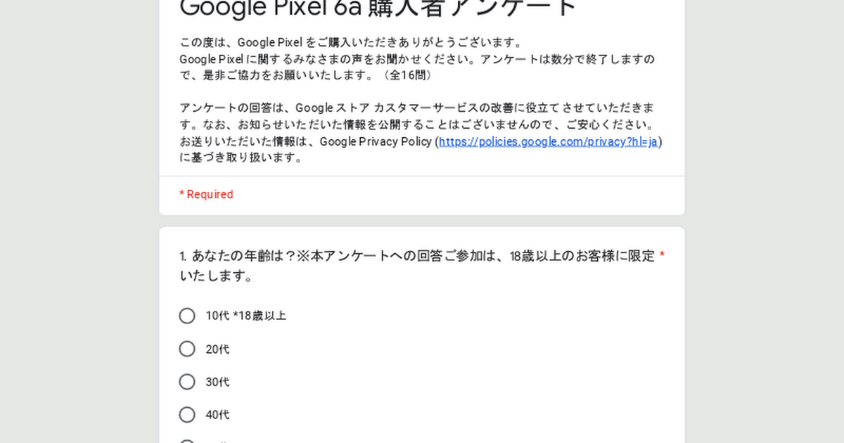 「Google Froms」を利用した全16問のWebアンケートです。前述の「Google Pixel Guide Book」やPixel 6aの初期設定についての設問もあるので、初期設定を終えてから回答した方がいいでしょう。