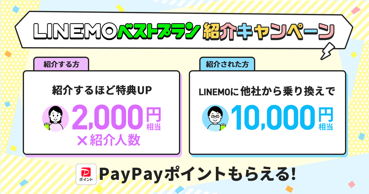 下記のリンクからLINEMOを契約すると1万円相当のPayPayポイントがもらえますよ。紹介リンクは2つ掲載しておきます。どちらでも同じなので、お好きな方をお使いくだされ。
